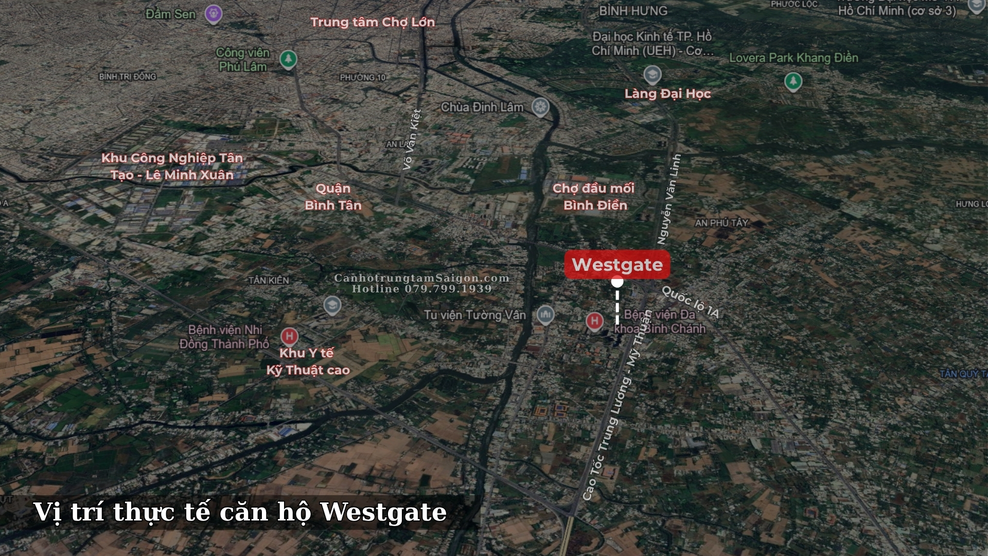 Dự án căn hộ cao cấp Westgate tọa lạc tại mặt tiền đường Tân Túc, ngay trung tâm hành chính Bình Chánh, sở hữu lợi thế lớn về hạ tầng và khả năng kết nối khu vực. Tuyến đường rộng rãi, thông thoáng, dễ dàng di chuyển đến các quận trung tâm TP.HCM.
